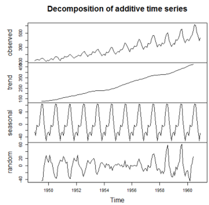 No primeiro retângulo temos a série temporal original (com todos componentes juntos). Abaixo dele temos o elemento tendência, veja que se extraiu o elemento tendência dos dados observados (série original do primeiro retângulo), vemos que ela foi extraída sem o elemento sazonal, temos apenas a tendência de crescimento. Abaixo dele no terceiro retângulo temos o elemento sazonal, podemos ver como ele fica mais claro e melhor observável quando extraímos ele, podemos ver que ele tem uma grande regularidade onde todos os picos são praticamente iguais. E por fim temos o elemento aleatório, basicamente é o que sobrou, os elementos inexplicáveis matematicamente.