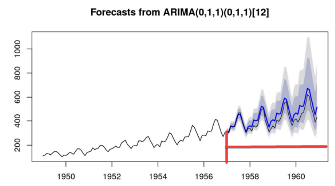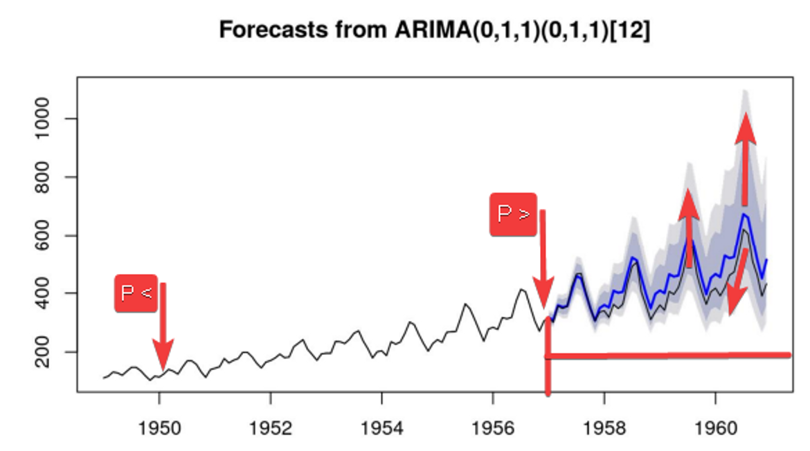 Quando falamos em previsão em séries temporais, diferente da regressão linear, nós estamos falando sempre em extrapolar, olhar os dados para frente, e a previsão só é possível com uma maior precisão quando a série temporal tem elementos que possam ser explicados matematicamente. Existem várias técnicas de previsão, clássicas como a do ARIMA (a qual falamos em meu primeiro artigo), suavização exponencial e redes neurais artificiais especificamente as recorrentes, principalmente a LSTM. Abaixo temos uma previsão feita com ARIMA: