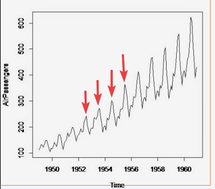 Efeito de um elemento que ocorre em intervalos de tempo regulares, no mesmo gráfico, podemos ver o transporte de passageiros, é natural que exista uma maior frequência de passageiros em período de férias, e em todos os anos existem picos: