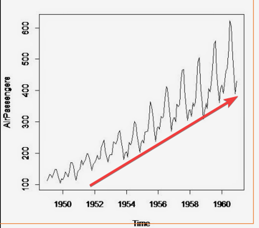 Assim como nome sugere, esse componente é uma tendência em relação aos dados da série. Se observarmos o gráfico ao lado podemos ver que existe uma tendência, a de crescimento. O modelo mais comum de tendência assim como na regressão, é o linear.